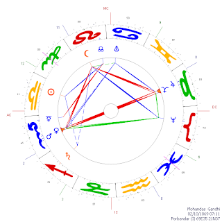 El signo de Libra, que aquí lo encontramos en el Ascendente y en el Sol, es un espacio de decisión, esotéricamente hablando las opciones están entre avanzar hacia Escorpio, siguiendo el camino del ser humano evolucionado o quedarse en el aspecto materia del signo de Virgo, y las mejores decisiones se toman en el silencio que permite oír la voz del interior, del yo superior. Asunto que Gandhi se tomó muy en serio dejando un día a la semana sin hablar. Paramahansa Yogananda cuenta en su autobiografía que conoció al Mahatma en su día de silencio.